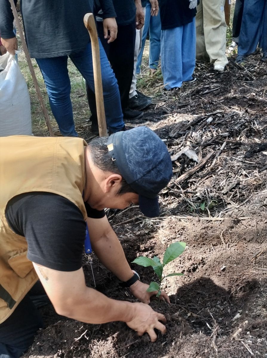 Satu per satu peserta menunduk, menggali tanah, lalu menanam bibit Kopi Liberika di antara gawangan sawit. Suara pacul berpadu dengan tawa dan obrolan ringan, menghadirkan suasana kebersamaan yang hangat. Dari kejauhan, deretan bibit kopi tampak seperti titik-titik hijau baru di antara batang sawit yang menjulang.